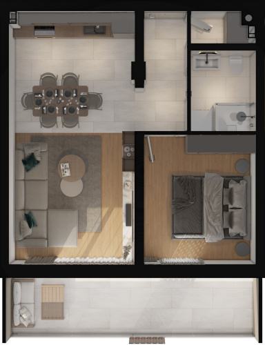 Ovaj funkcionalan stan sastoji se od ulaznog hodnika, kuhinje sa blagovaonicom, ostave, kupaonice, dnevnog boravka,  spavaće sobe i loggie.
